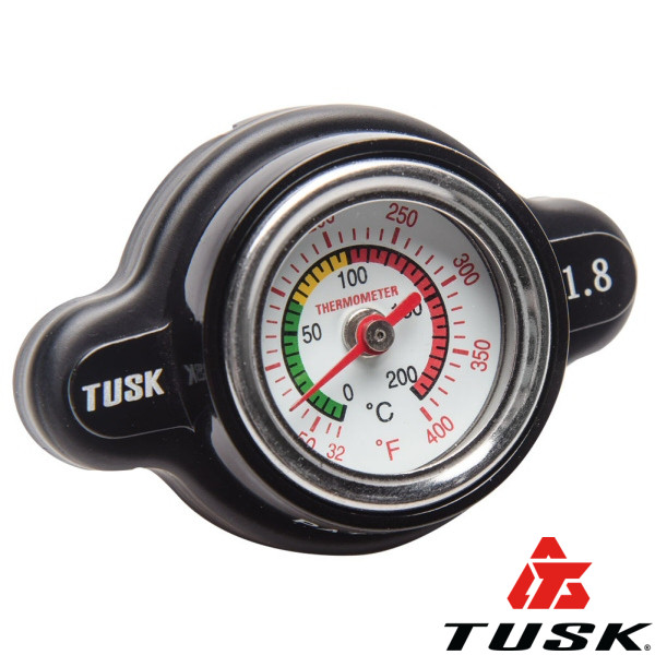 The Tusk High Pressure Radiator Cap with Temperature Gauge makes it easy to keep an eye on your machine’s temperature. The radiator caps are designed with a higher pressure rating than OEM caps in order to raise your coolants boiling point. This reduces boiling over and losing coolant. Equipped on top of the cap is a temperature gauge so you can read how hot or cold your machine is running. Offered in a 1.8kg/cm2 (25.6psi) for most motorcycles, ATV’s, and UTV’s (excluding European models)